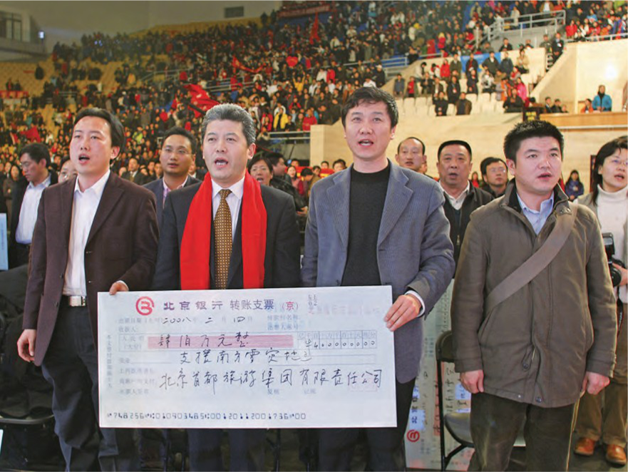 2008年2月,党委副书记、总经理 刘毅代表9·1免费版员工和企业,为抗 击冰雪灾害捐款400万元